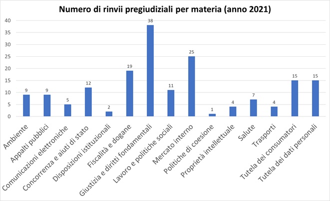 Di seguito si pubblicano le rappresentazioni grafiche dei rinvii pregiudiziali classificati sia per materia e/o macroarea che per Stato della giurisdizione di rinvio.