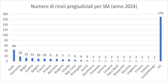 Di seguito si pubblicano le rappresentazioni grafiche dei rinvii pregiudiziali classificati sia per materia e/o macroarea che per Stato della giurisdizione di rinvio.