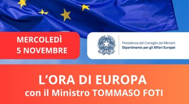 Il 5 novembre alle ore 11 torna L’ora di Europa, il webinar promosso dal Dipartimento per gli Affari Europei: una conversazione con il Ministro Tommaso Foti per studenti e docenti delle scuole secondarie di secondo grado sulle sfide, le opportunità e le prospettive dell'Italia in Europa.